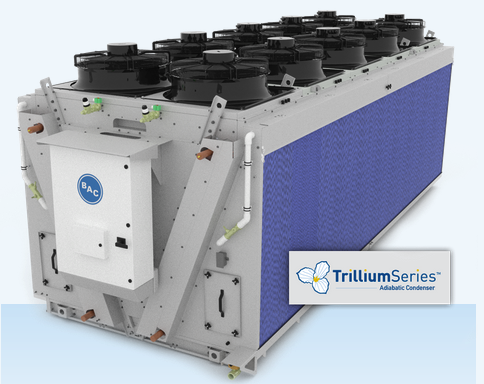 The BAC TrilliumSeries® Adiabatic Condenser for CO₂ systems is engineered for high-efficiency transcritical applications, supporting pressures up to 120 bar. It features BAC’s patented Dry-Coil Adiabatic™ design, which uses water only when needed to pre-cool incoming air, significantly reducing condensing temperatures, energy use (up to 44%), and water consumption (up to 90%). Optimized for CO₂, it includes a redesigned low-charge coil offering up to 17% more capacity, EC fans with variable speed control, and EcoFlex integrated controls for smart water and fan management via Modbus/BACnet. Capacities range from 430 to 1,990 kW, making it ideal for sustainable supermarket and industrial refrigeration.